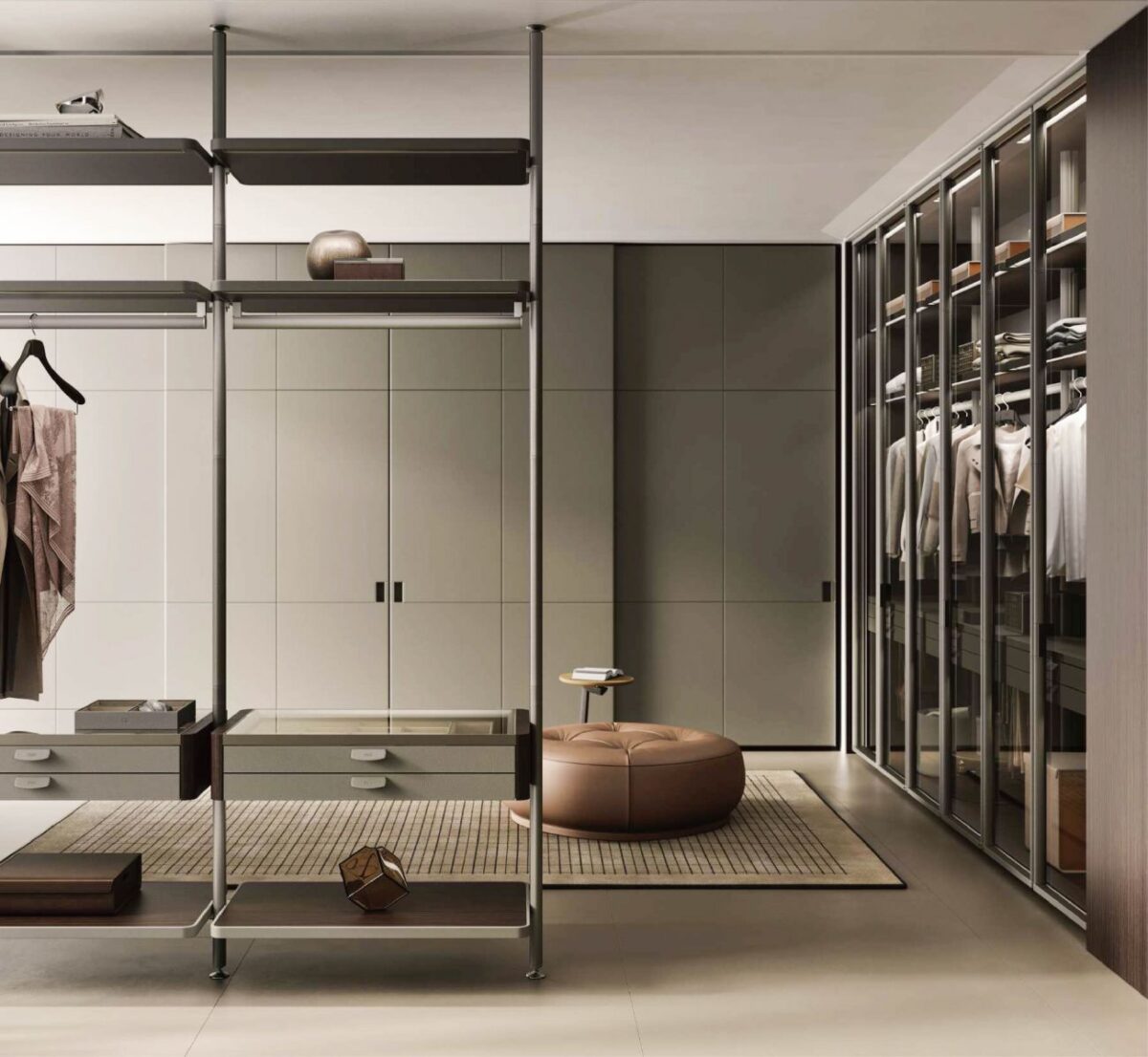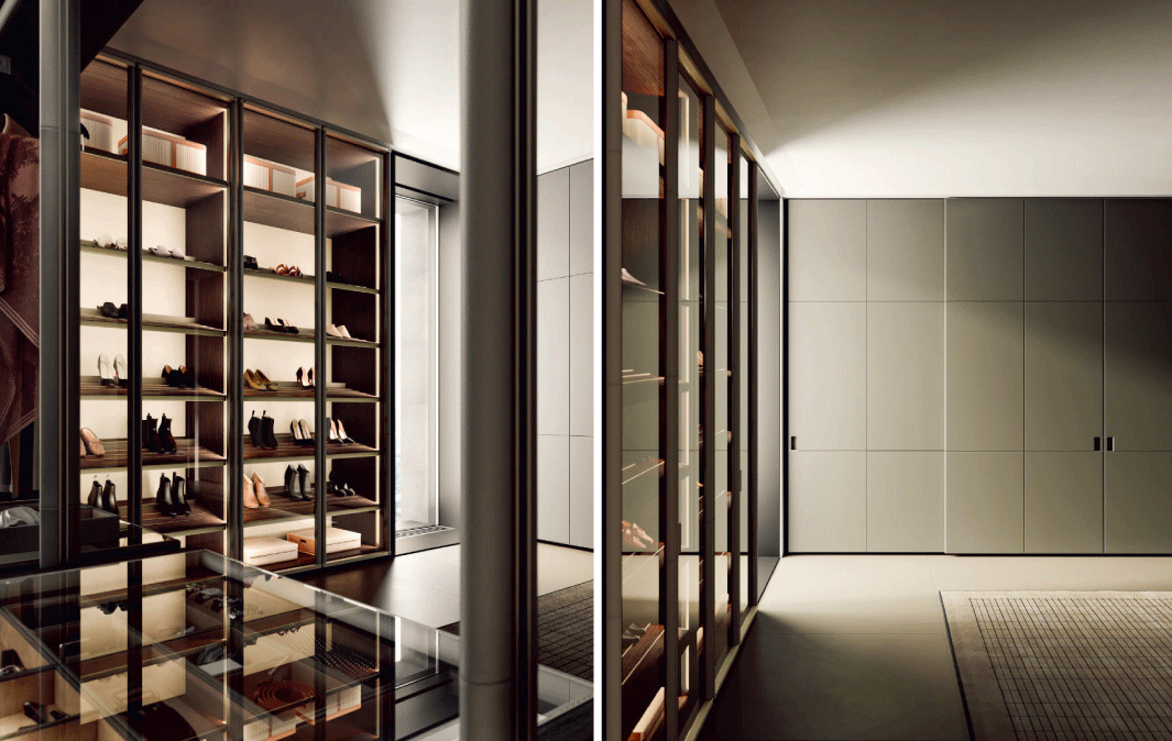 至於衣櫃門片材質,也有多種選擇如青銅色玻璃、木皮或全皮革包覆,在透視與遮蔽之間,在展示與保留之間,自由轉換。