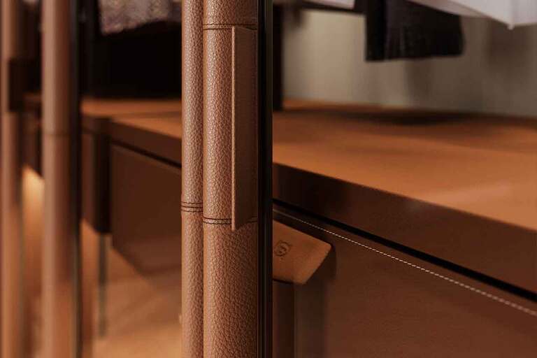 材質的運用,是 DressCove 最富 Poltrona Frau 精神的一環,品牌標誌性的 Pelle Frau® 皮革貫穿整體結構:從立柱、門片邊框、把手甚至層板邊緣,都可包覆皮革,它柔軟的觸感與金屬結構形成微妙對比,讓理性的模組系統包裹上溫潤質地,招牌的 ColorSphere® 18 色皮革色彩,則確認了使用者的品味喜好。