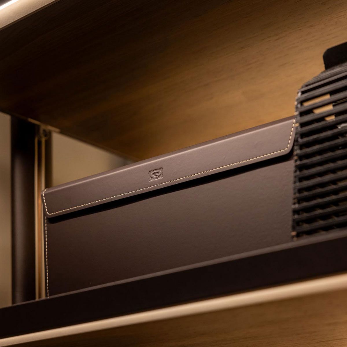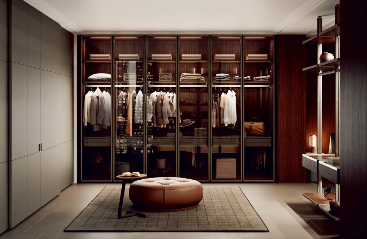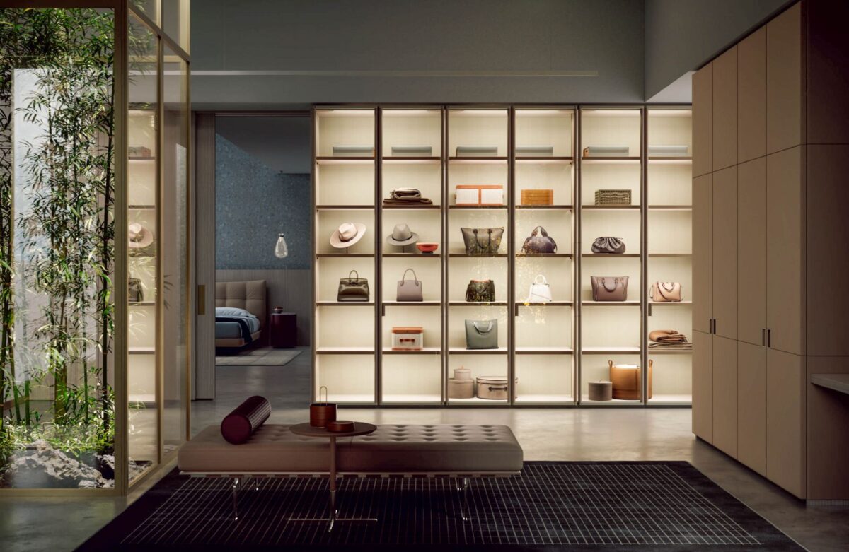 在 Bonuccelli 的規劃下,收納空間不再只是家具,而是講究秩序、空間感與比例結構的建築;另一方面,身為材質工藝專家的 Poltrona Frau,則以其標誌性的 Pelle Frau® 皮革,結合精緻木材與玻璃等高級材料,細緻打磨每處細節。