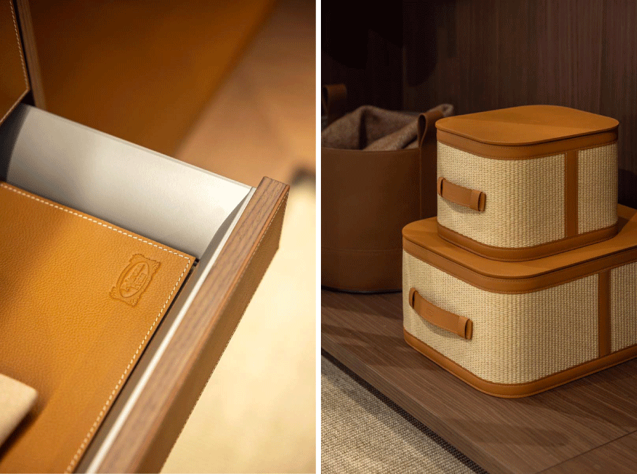 「Beautilities」的配件系列,像是:皮革與藤編製成的收納盒,抽屜內的珠寶盒,皮革細節的衣架,可堆疊的收納容器……使衣櫃內部同樣呈現與客廳家具相同的質感與設計語言,環環細節將整理衣物提升為精緻的日常儀式。
